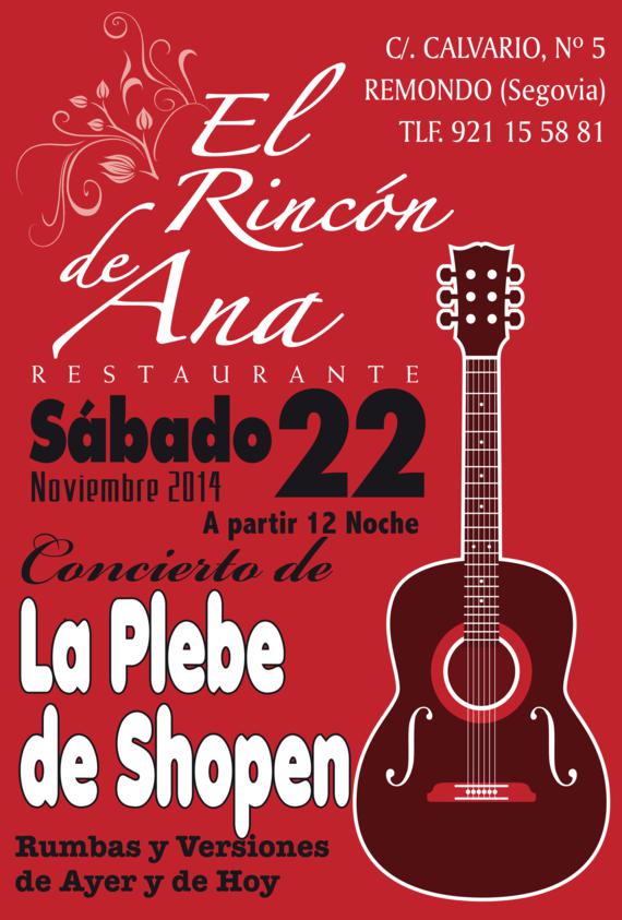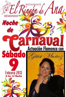 El próximo sábado, 9 de Febrero, a las 12 de la noche en elRestaurante EL RINCON DE ANA ACTUACION MUSICAL de la artista de la Copla y el Flamenco, GÜISI MUÑOZ como celebración de la Fiesta de Carnaval.