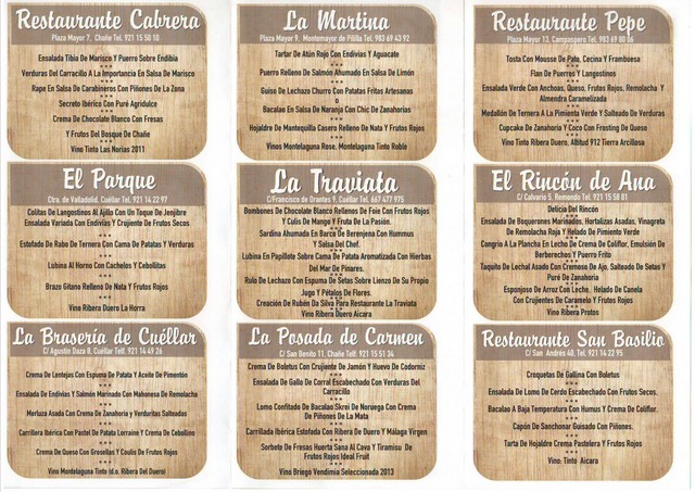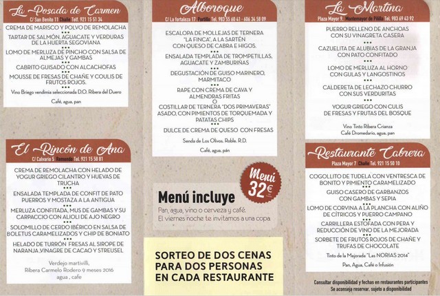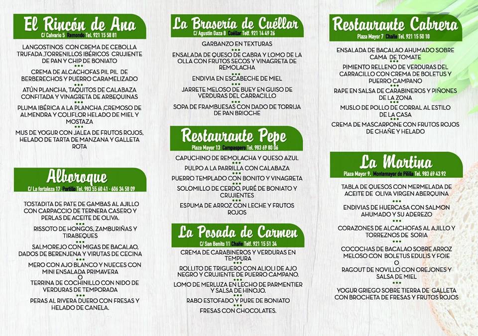 Los menús se han consensuado a un precio de 28 euros. En estos menús los visitantes degustarán productos autóctonos y especialidades culinarias de las localidades participantes, y los platos principales contarán con productos de la huerta del Carracillo, lechazo y pincho de lechazo.