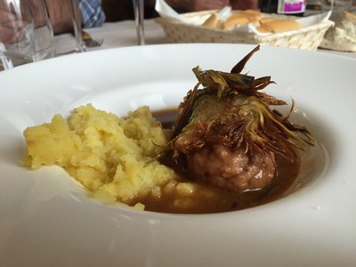 Albóndigas de cordero con puré trabado de patatas y chips de alcachofas.