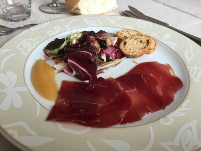Bouquet de mézclum con láminas foie, manzana, pan de especias, frambuesa y abanico de cecina.