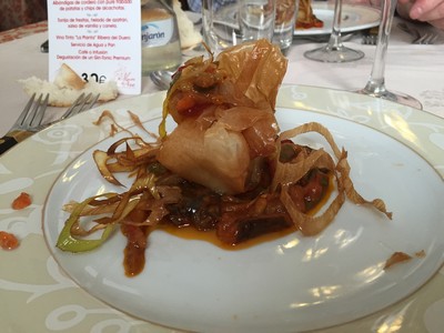 Crujiente de bacalao sobre lecho de pimientos fritos, dulce de tomate y puerro.