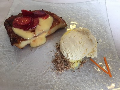 Torrija de fresitas, helado de azafrán, salsa de vainilla y canela.