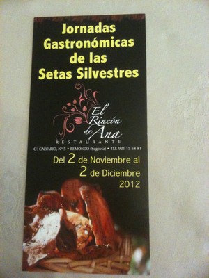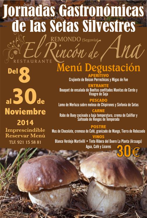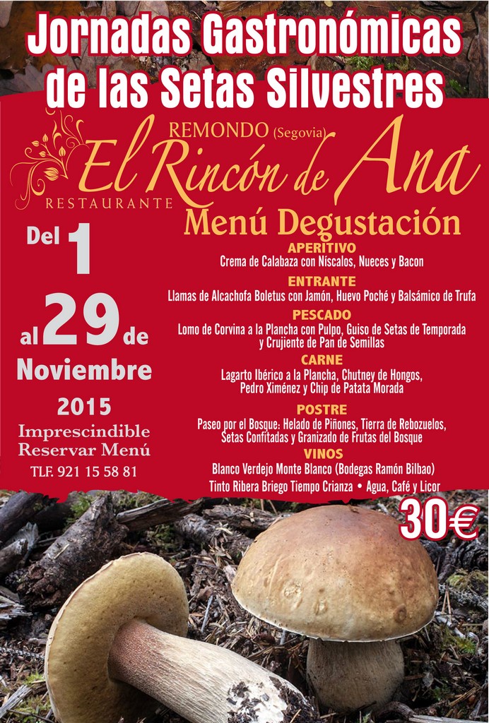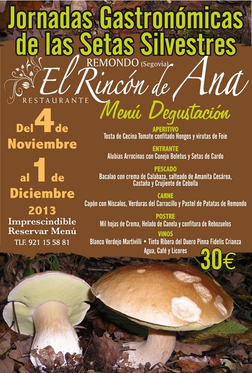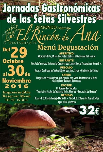 JORNADAS GASTRONOMICAS DE LAS SETAS SILVESTRES. Venga a disfrutar de un excelente Menú Degustación que hemos elaborado por sólo 29 €. Destacamos "El Crujiente de Hongos en Salsa de Langostinos", "Carpacho templado de Boletus con Lechuga de colores y Migas de Fua al Aroma de Balsámico", "Albóndigas de Rape con Champiñones", "Arroz Rissoto de su Salsa", Timbal de Cordero guisado con Colmenillas y Verduras del Carracillo"