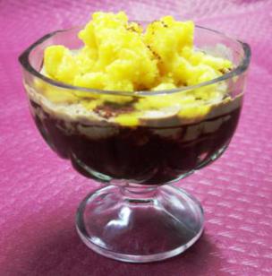 Mousse de Chocolate, Cremoso de Café, Granizado de Mango, Tierra de Rebozuelo