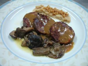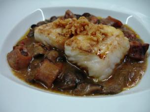 Lomo de Merluza sobre meloso de Chipirones y Sintonía de Setas